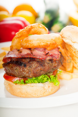Classic american hamburger sandwich with onion rings and french fries, with fresh vegetablesContent description: Classic american hamburger sandwich with onion rings and french fries, witClassic american hamburger sandwich with onion rings and french fries, with fresh vegetablesh fresh vegetablesContent author: keko64© keko64 / PhotogenicaModel Release: no information availableCollection: PhotogenicaKeywords for the item PHA0009817: backgroundseed <agriculture>colourfulredwhitefat <obese>breadpotato <staple>tomatoonion <vegetable>DeliciousrolldinnerFast FoodmeatLunchFrench friesSandwichsnackcheeseplatejunkHamburger <Fast Food>CheeseburgerbeefmealnourishmentfreshbigFrench<adjective>tastyjuicyAmerican Culturefastclassicalbaconbarbecuedonion ringfriedcolourfoodBurgerCheddarred bell pepperCuisineLettuce <Lactuca>Paprikasesame <plant>The content titled Classic american hamburger sandwich with onion rings and french fries, with fresh vegetables can be purchased at the Photogenica image bank on the basis of the Royalty Free licence. All images, illustrations, vector files and motion clips can be downloaded immediately after the purchase (after completion of the payment). |